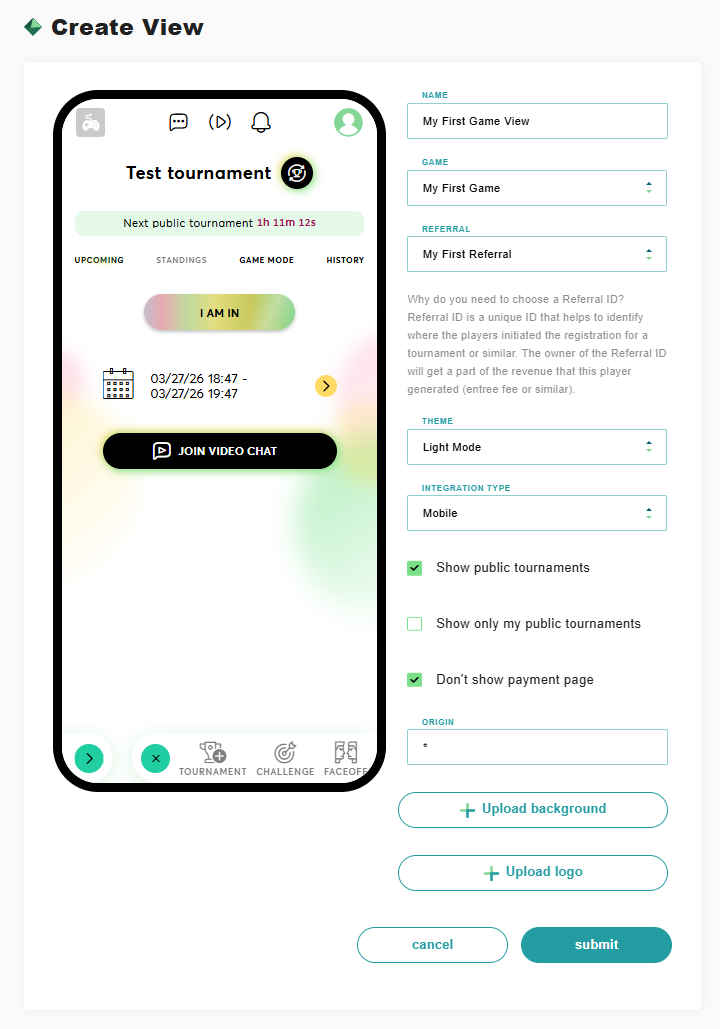 Choose "Public tournament", enter the name and description of the game. \