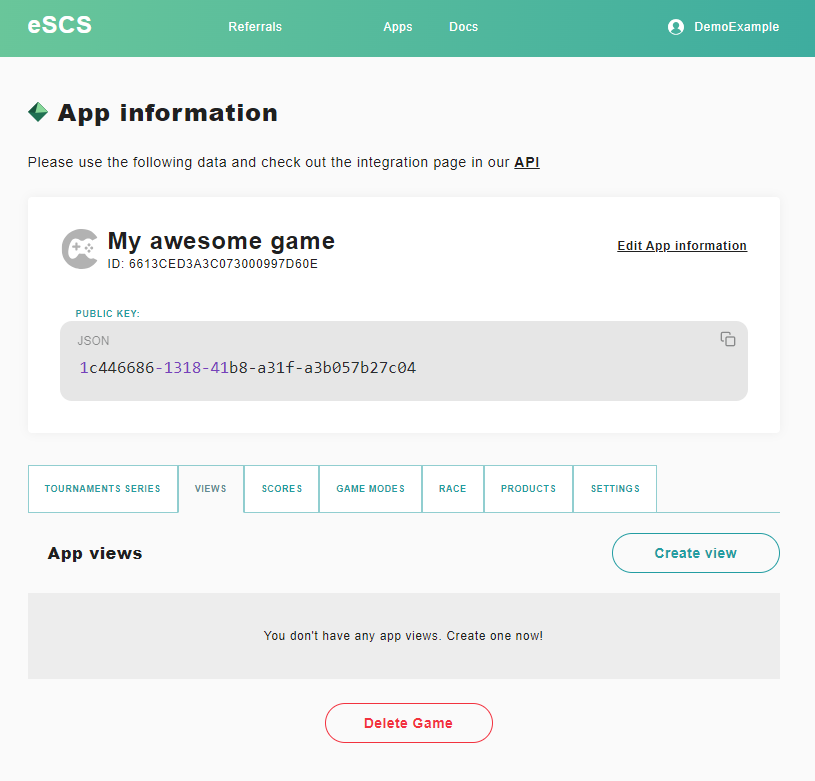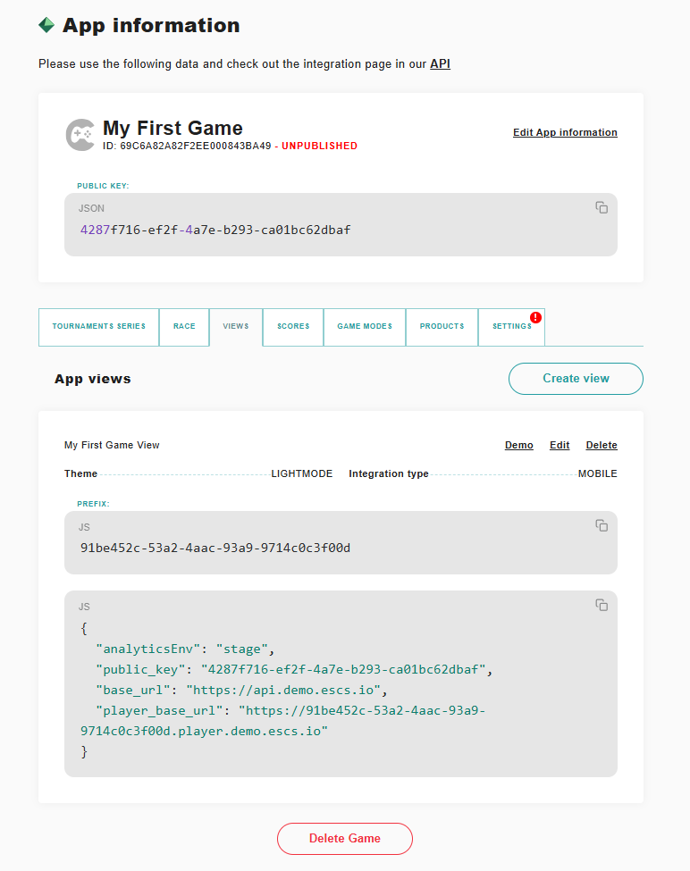 Copy your **public key** and the **player\_base\_url** and go to the ["Integration - Step 2"](https://docs.escs.io/integration-step-2).