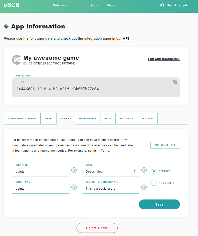 Now click the tab "Scores" and setup your first game score: the basic metric that measures how good your players are in your awesome game. For example, in Tetris it's points. "Sort" defines if higher values are better (choose "Desc" for that) or lower values are better (choose "Asc" for that). Score name is shown to the players.  You can have as many scores as you want. Define just one for now.&#x20;