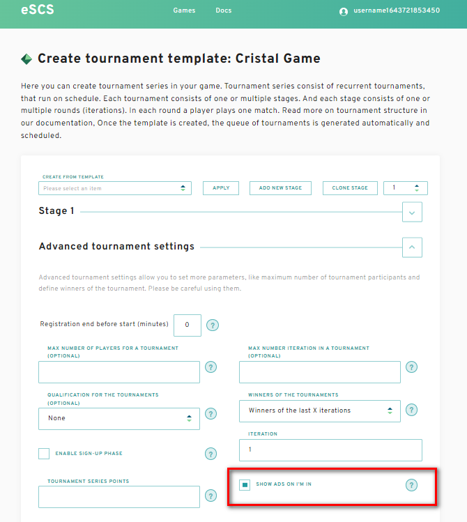 When creating a tournament series for your game select the "**Show Ads on "I'm in**" checkbox as shown below to activate additional actions before the user can join a tournament.